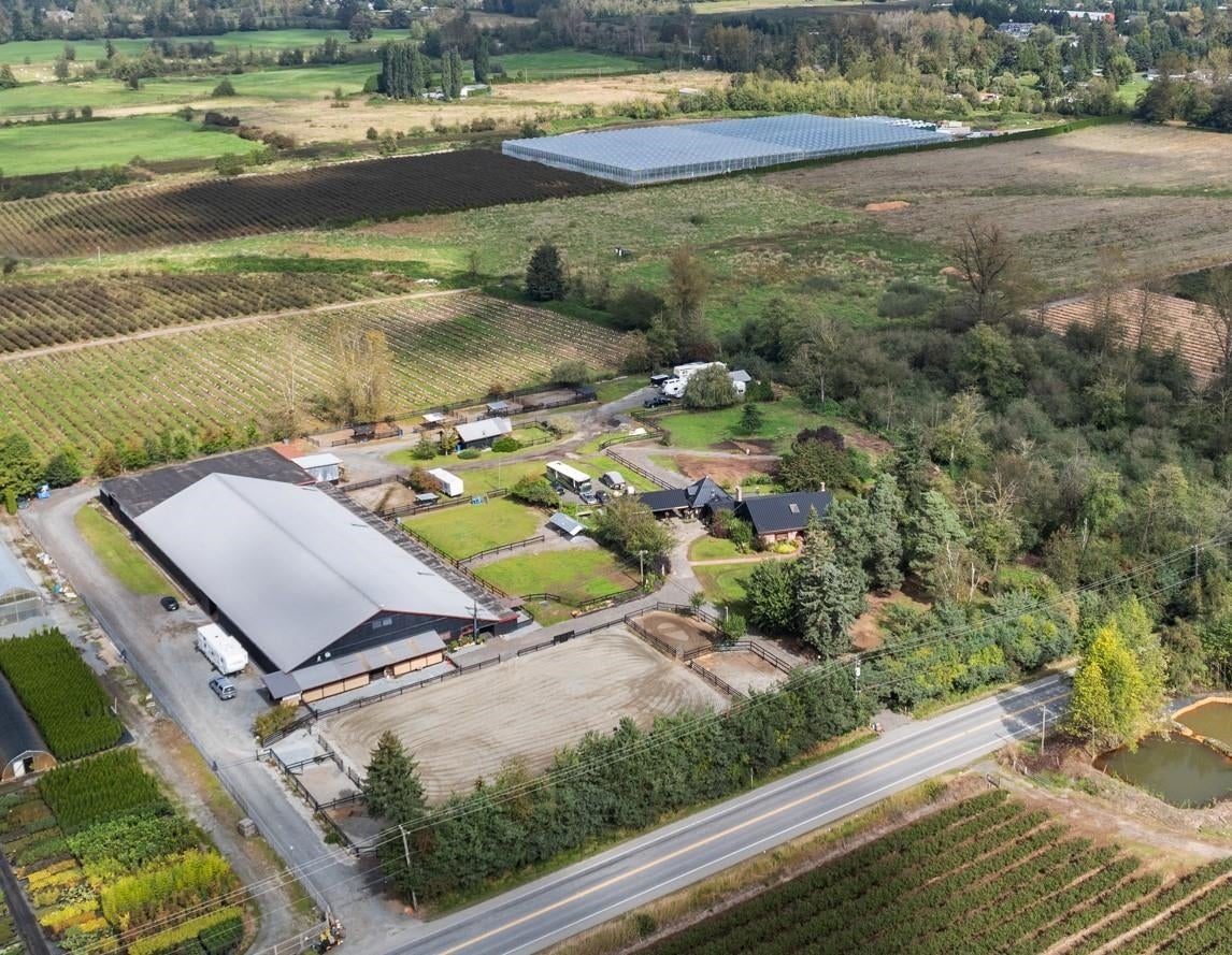 9 Acres in PREMIER LOCATION!Perfect for equestrian professionals or savvy real estate investors,the property features TWO driveway accesses, an impressive 110x270 INDOOR ARENA total 30,000 sqft 31 stall BARN with access for oversized vehicles as well as a large outdoor arena. Attached suite accompanies the arena, perfect for staff or generating rental income. The spanish style 3bed, 2bath main residence, boasts wrought iron gated front entrance, arched doorways, exposed beam ceilings,2 cozy fireplaces,wine cellar and a metal roof. Additionally, a 1 bedroom cottage or mortgage helper, ample parking throughout the property,a large blacktop milling circular driveway all make this a truly rare find! ENDLESS multi revenue opportunities! All located close to HWY 1 and Aldergrove Border Crossing