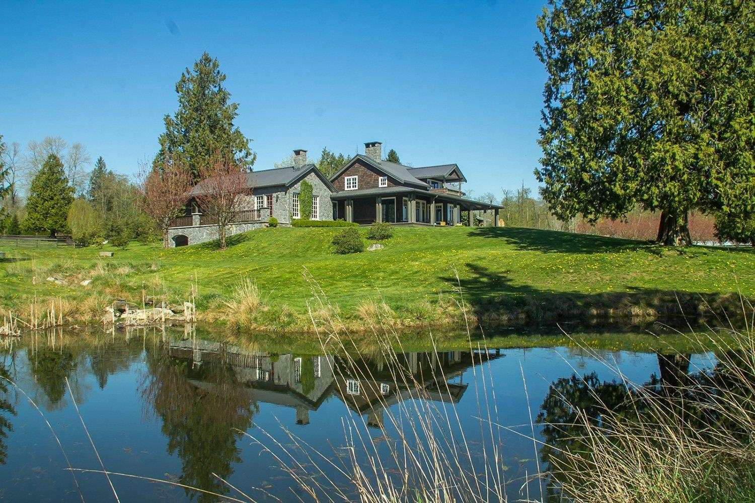 WORTHY OF AN ARCHITECHURAL DIGEST FEATURE ARTICLE. Very private setting dotted with large evergreens fabulous Mt. Baker view at the end of no thru St. Architecturally designed to create an old world feeling, incorporating century old times & wide plank wood flooring, custom made wood windows & doors. Rock faced master wing with high vaulted ceiling & wood burning FP. Lots of old timbers & beams . Bdrm with ensuite, office & den with wood burning FP upstairs. Covered veranda, covered breezeway connecting 720 sq.ft guest wing & garage with office to main part of the house. Lots of mature plantings, 2 lakes/ponds are home to wild ducks.
